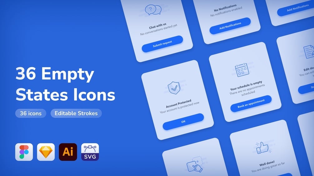 - 36 empty states icons incl extended license for 12 free icons + 24 additional premium icons.