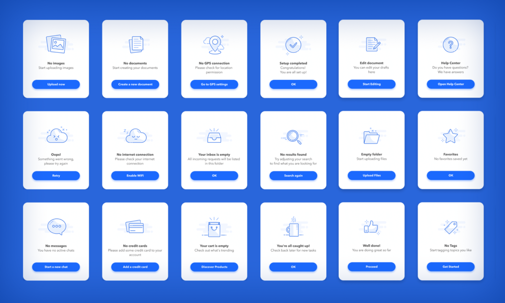 - 36 empty states icons incl extended license for 12 free icons + 24 additional premium icons.